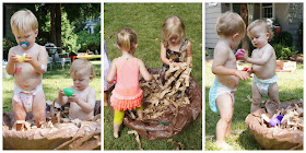 We created a bird's nest using our small pool, a brown tarp, grocery bags cut into strips and our Easter eggs. My two assistants, Hunter and Emerson, helped me crinkle the strips to make them look more nest-like.